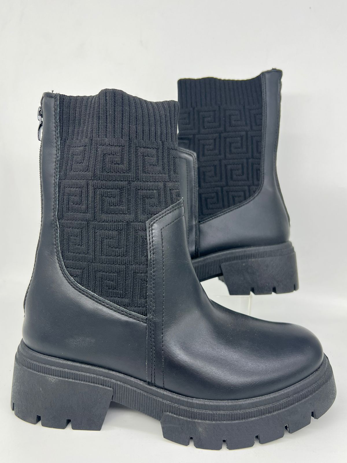 بوت كاحل أسود جلد ونعل سميك (Chunky) - بتفاصيل محبوكة هندسية