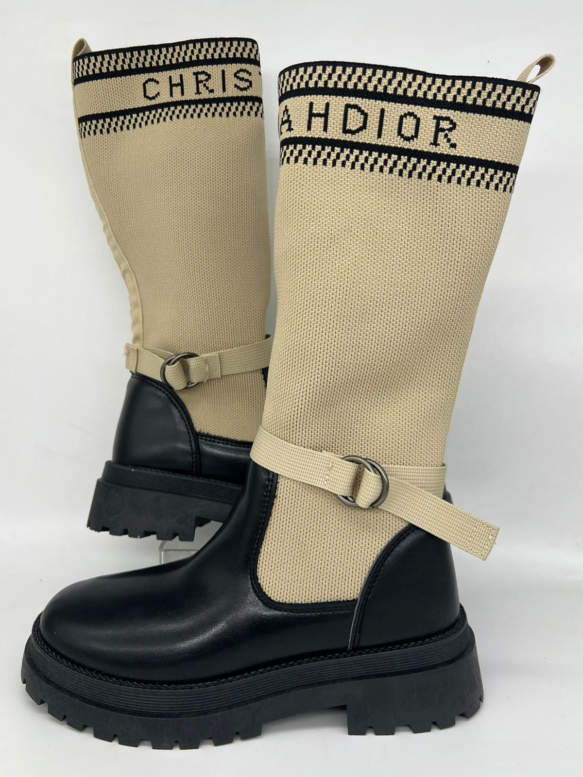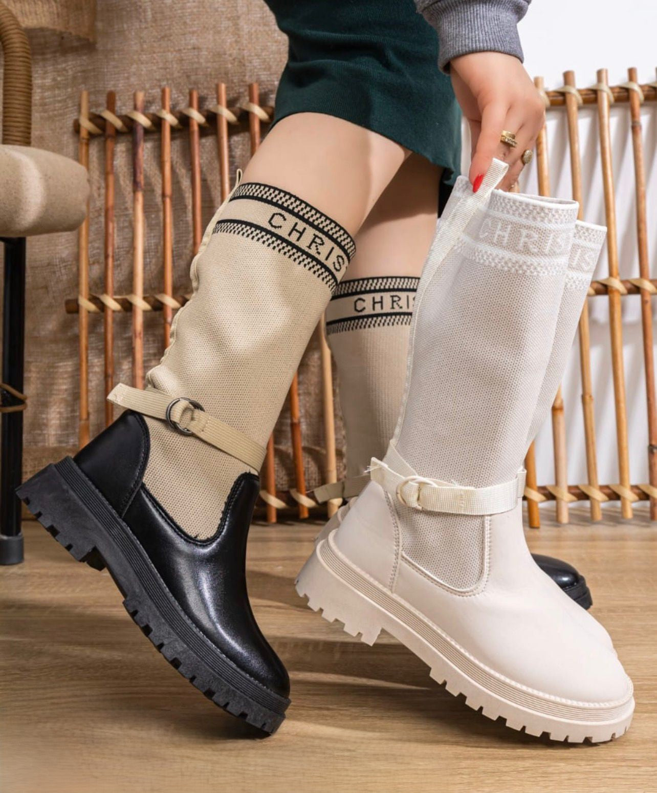 بوت "كريس" طويل كاجوال مريح - نعل سميك ومحبوك (لون بيج/أوف وايت)