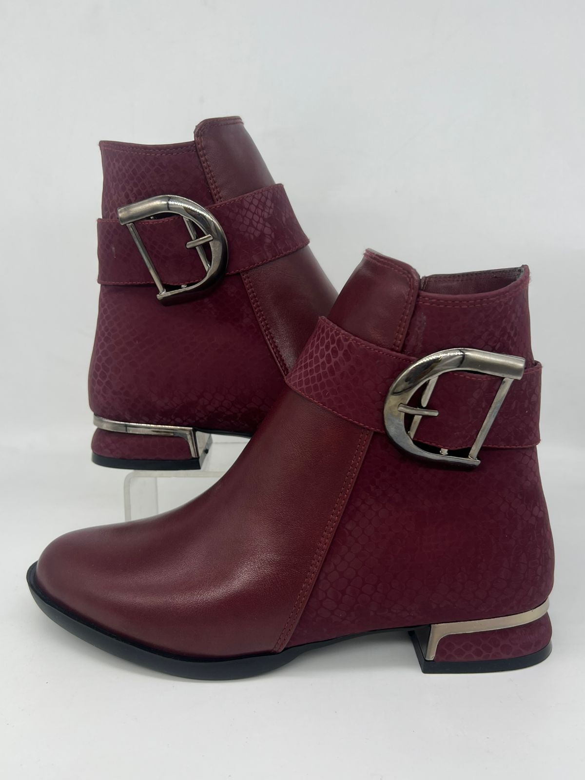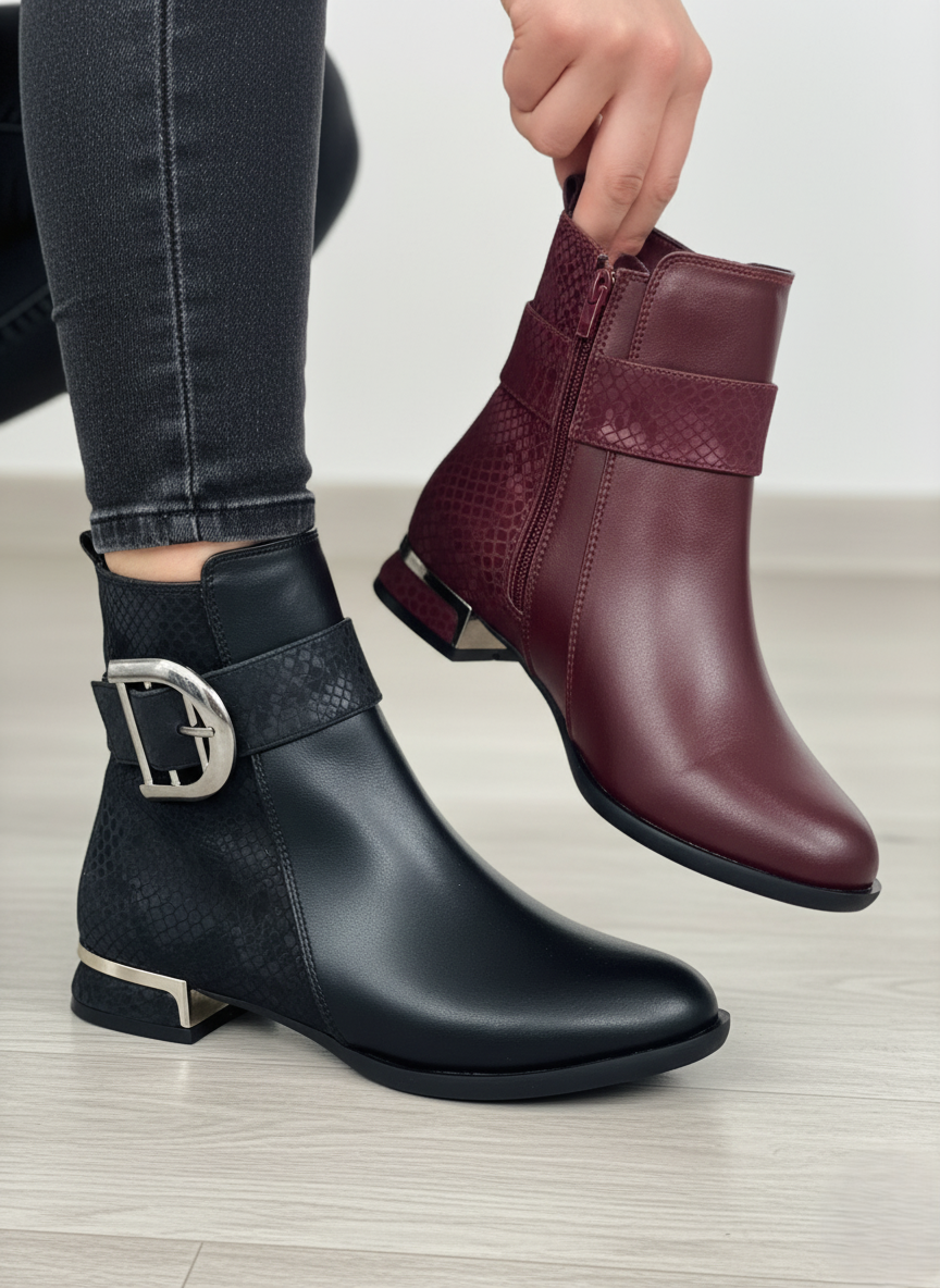 تصميم فريد: يجمع بين الجلد الناعم ولمسة جلد الثعبان البارزة حول الكاحل، مما يمنحه مظهراً عصرياً وجذاباً.