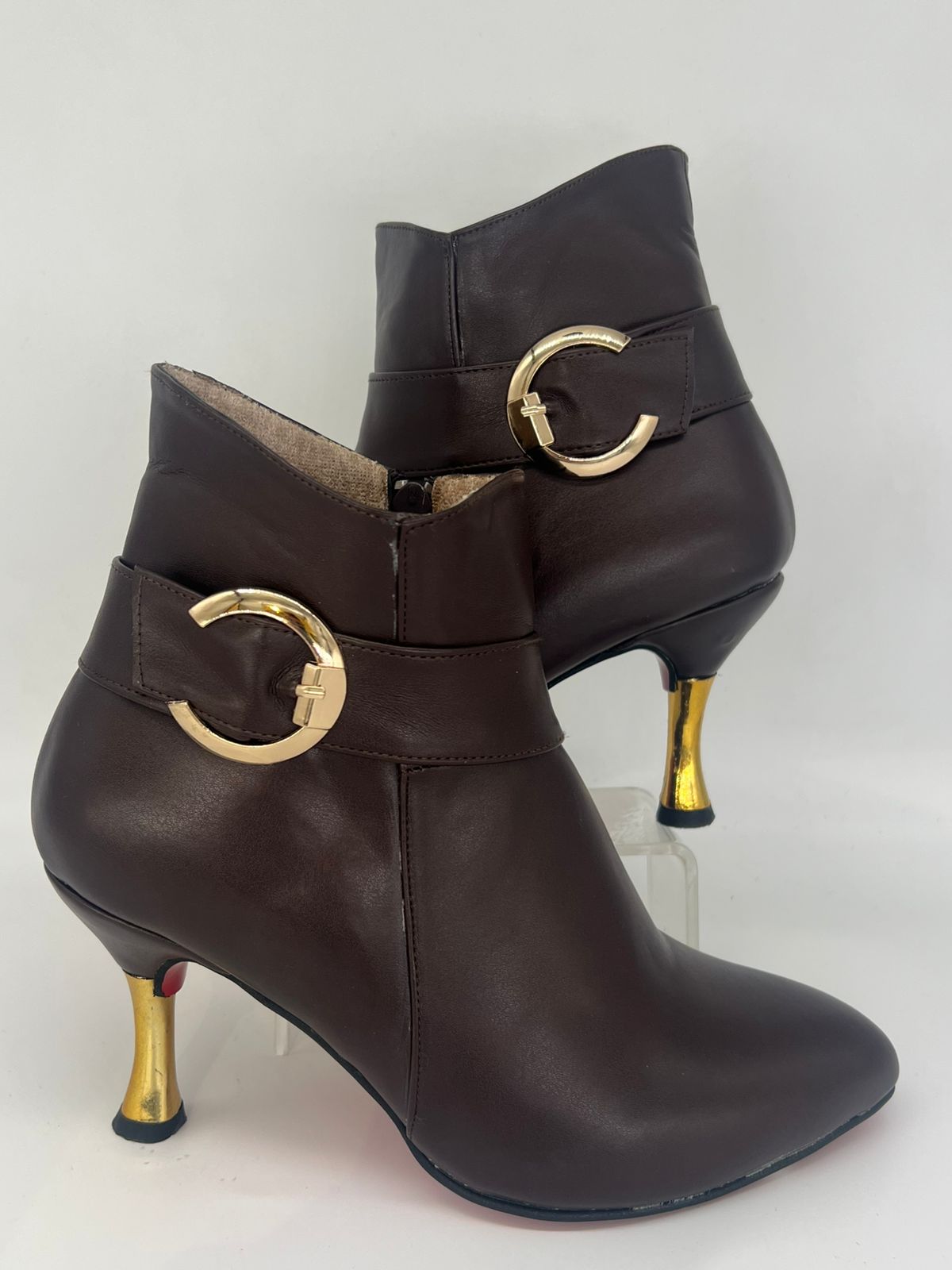 كعب Stiletto ذهبي: الكعب الرفيع (Stiletto Heel) ده معمول بتفصيلة معدنية ذهبية بتدي لمسة فخمة جداً ومختلفة عن أي كعب تاني.
