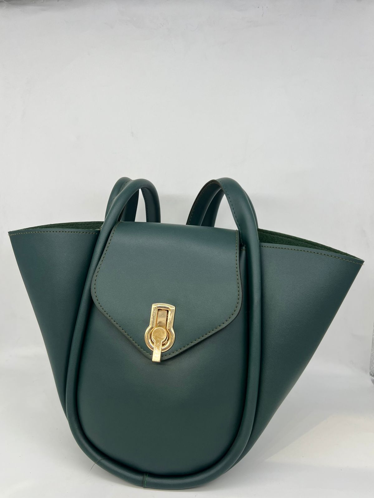 تصميم هندسي فريد: الشكل الجانبي للشنطة واسع ومفتوح (شكل سلة/توت)، مع جزء علوي يغلق بواسطة غطاء أمامي أنيق.